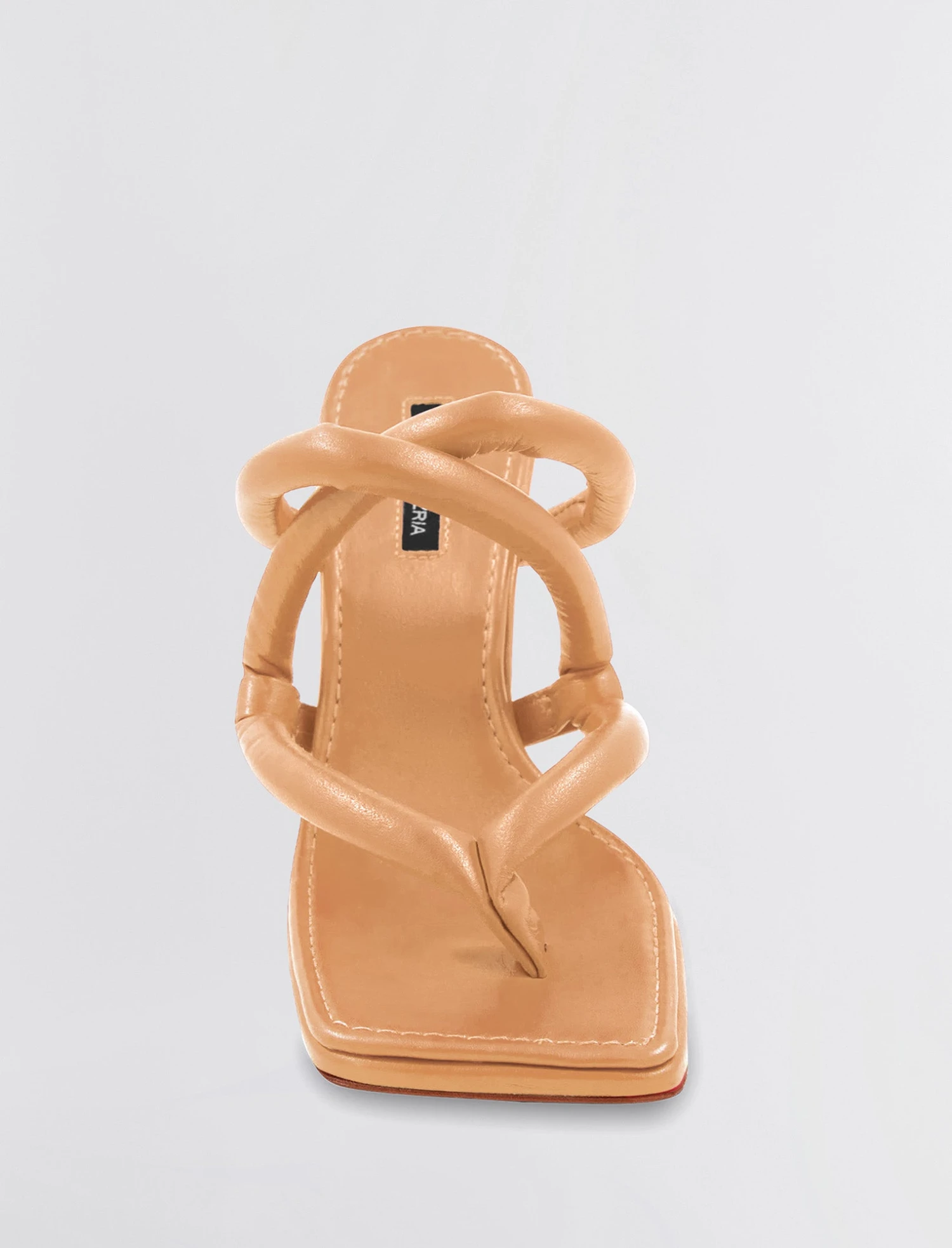 Chunky stiletto sandal crafted from smooth leather in a slip-on design. Done with a thong strap framed by a modern square toe.