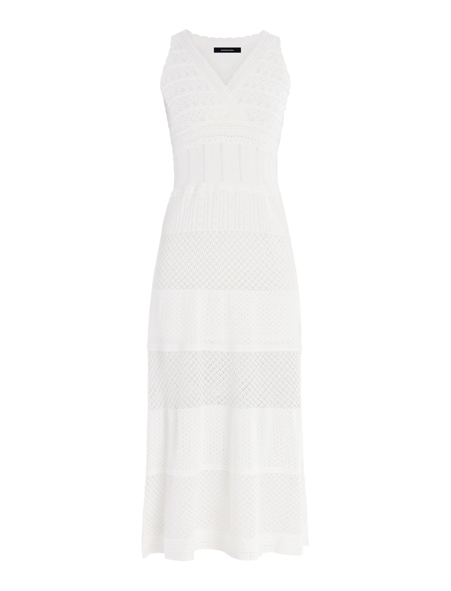 Midi dress cut from a mix stitch pointelle knit. Done with a surplice V-neck in a pullover fit-and-flare silhouette. Finished with a fluted hem for a feminine look.