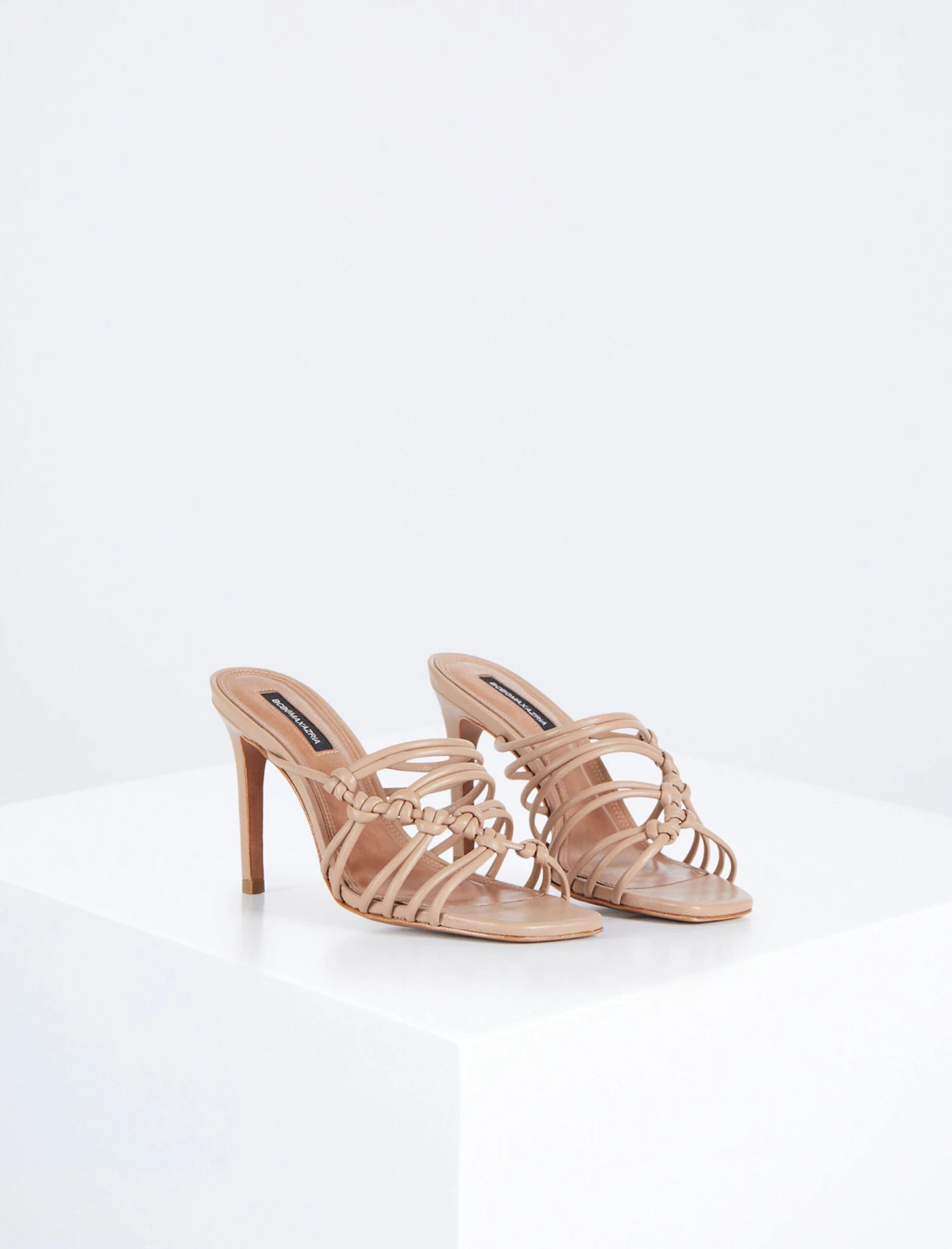 Chic slip-on sandal crafted from leather in a multi strap design with knotted accents. Framed by a modern square toe and finished with a sleek stiletto heel.