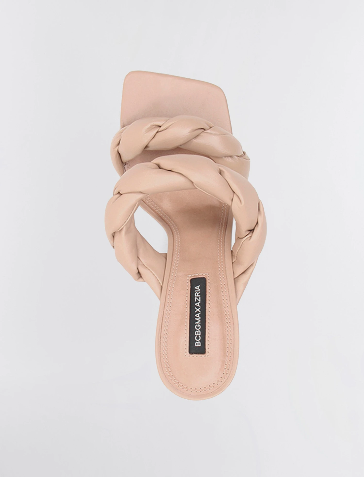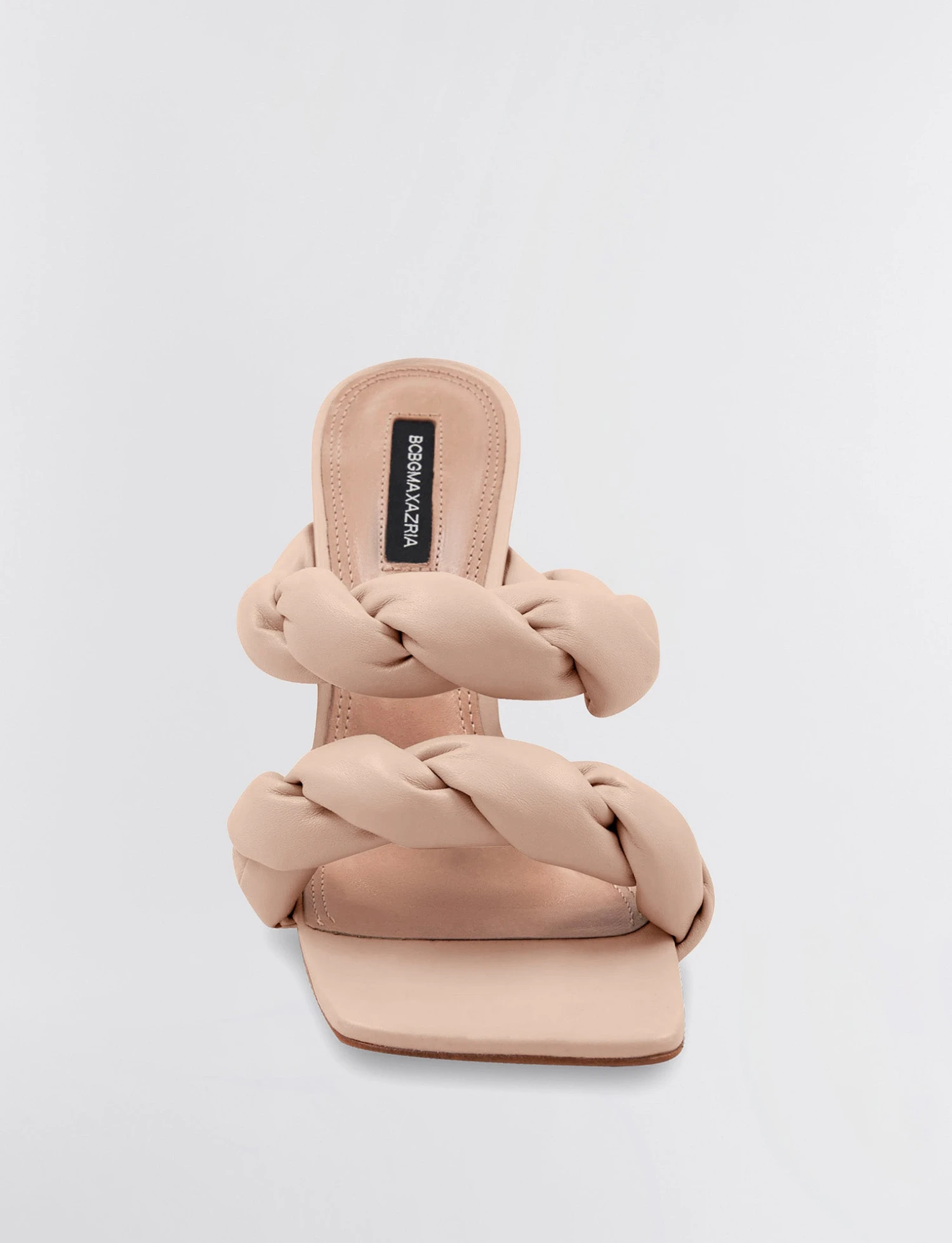 Striking slip-on sandal in a two-strap twisted leather design. Made with an open square toe and complete with a stiletto heel.