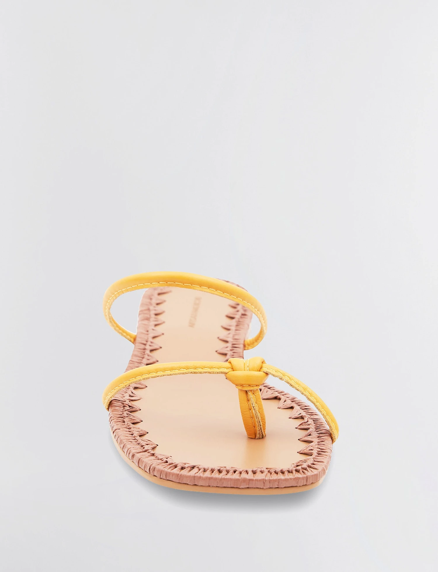 Simple slip-on sandal crafted from leather in a stitched design. Made in a knotted thong toe silhouette with tubular straps. Finished with a smooth leather footbed with a raffia wrapped trim.