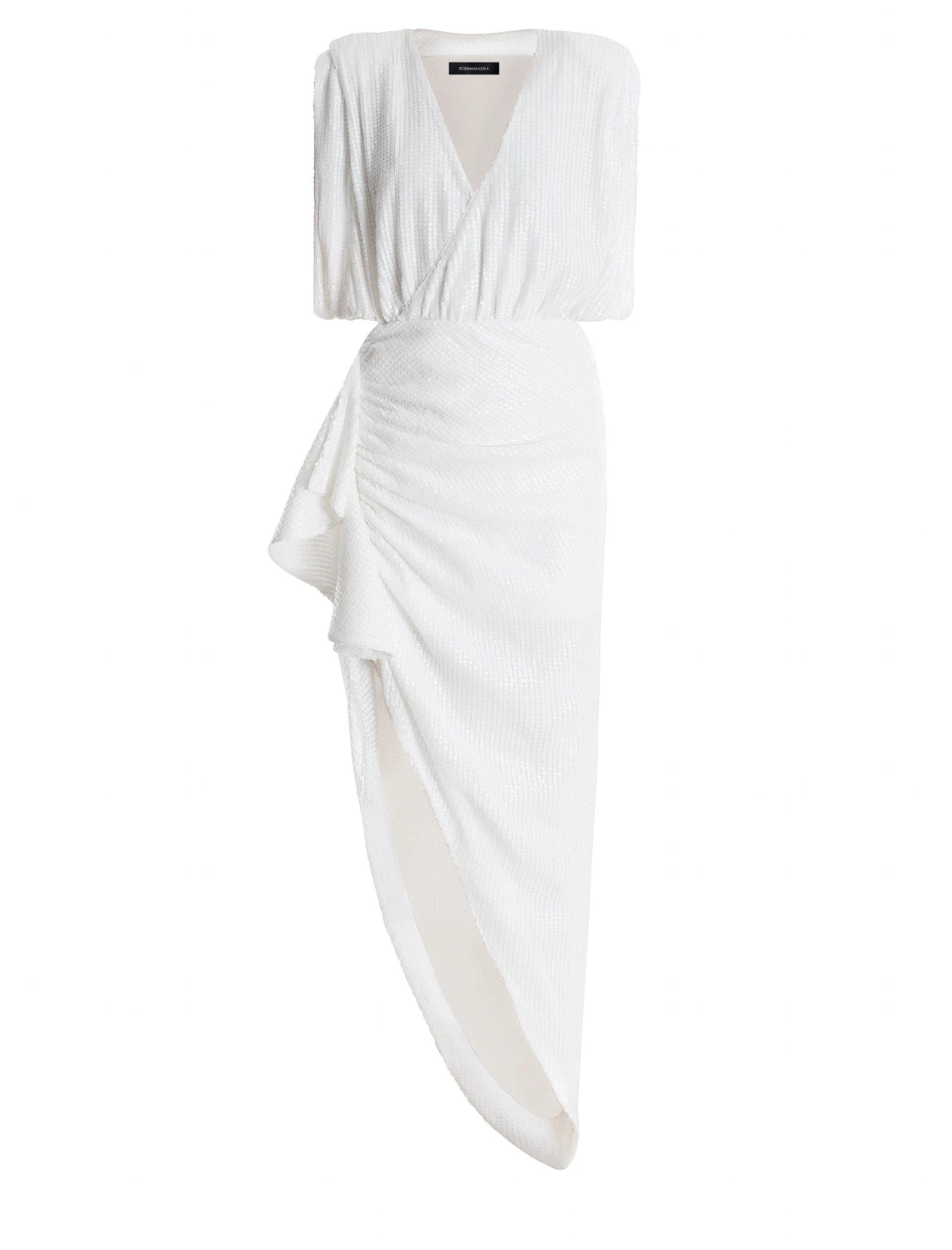 Sparkling white gown done from shimmering sequins. Crafted with oversized cap sleeves and structured shoulder pads for a bold look that’s balanced by a feminine faux wrap skirt. Detailed with a waist cutout, the skirt features ruching with a cascading ruffle, highlighting a high-low hem. Complete with a concealed side zip.