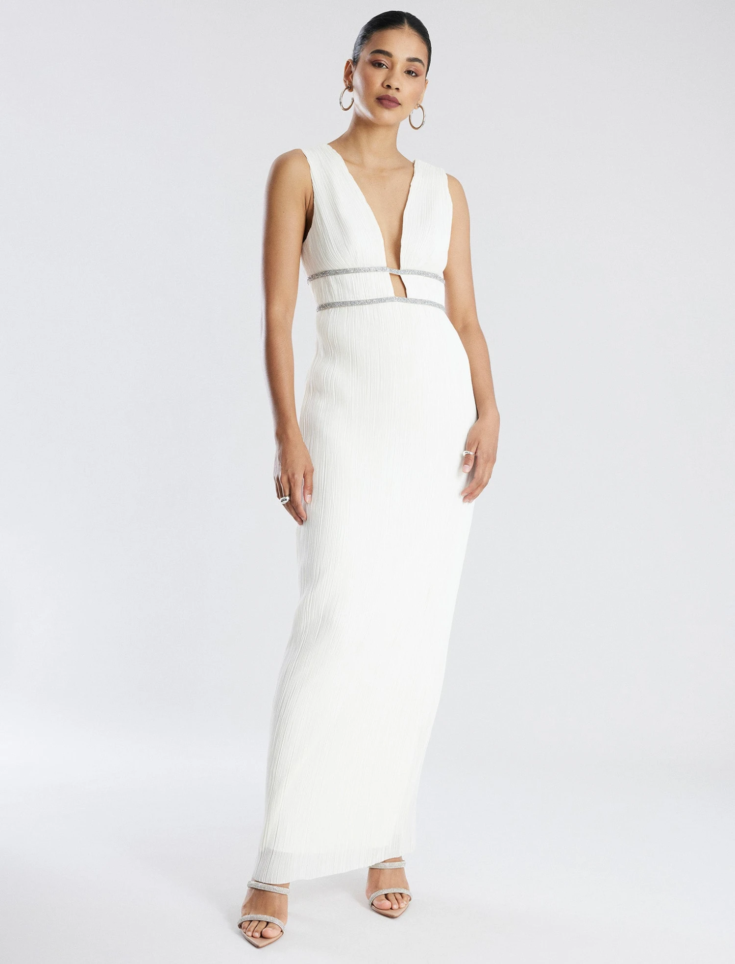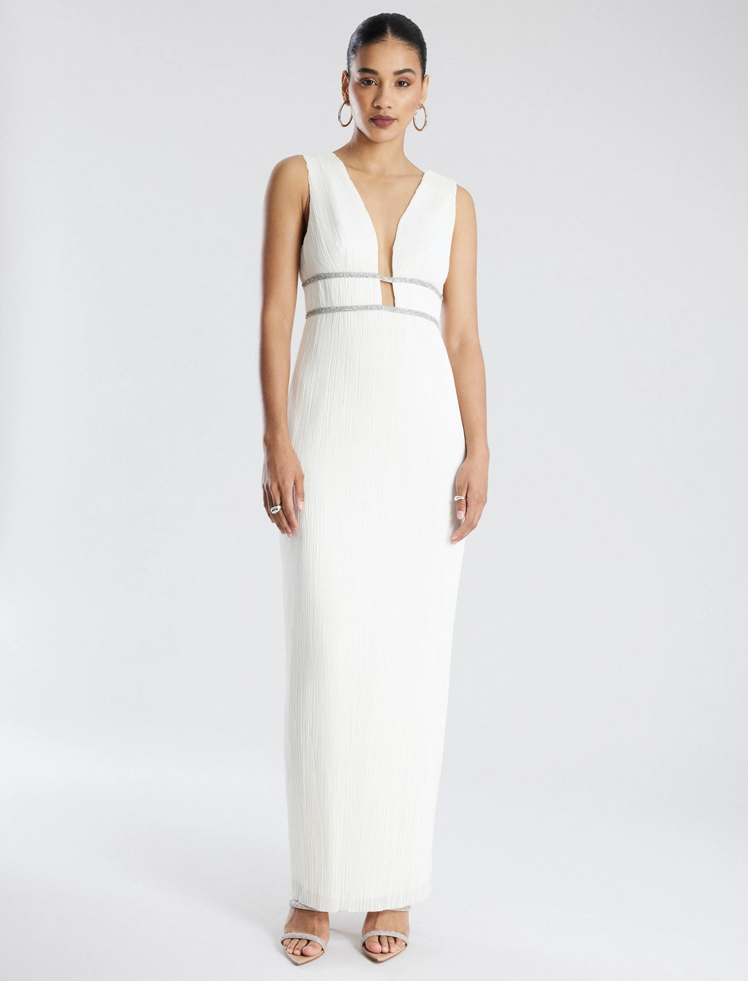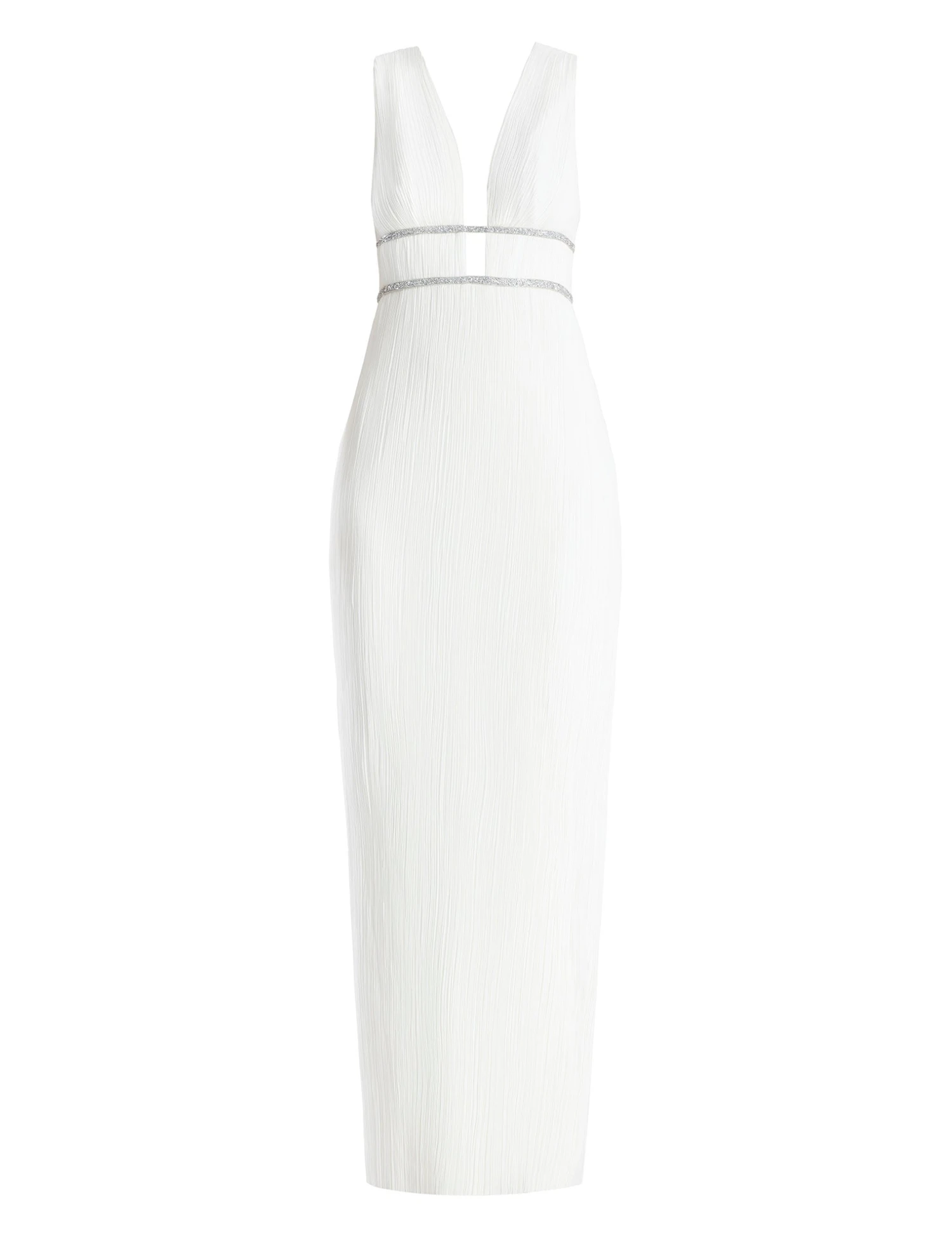 Showstopping gown in white with a goddess-inspired design. Done from pleated chiffon with a plunging V-neckline. Crafted with two sparkling beaded waistbands for a touch of glamor. Designed in a sheath style with a V-back and a concealed back zip closure.