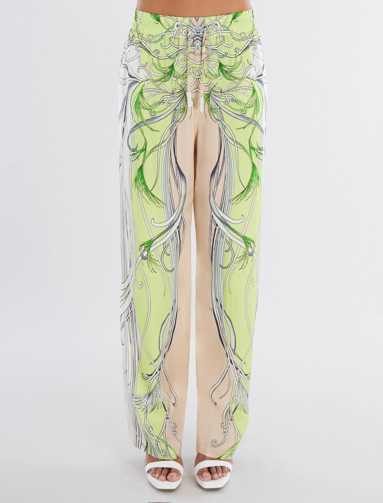 Elevated pant perfect for weekends or travel. Done in a brightly printed design. Finished in a wide-leg silhouette with front pockets.
