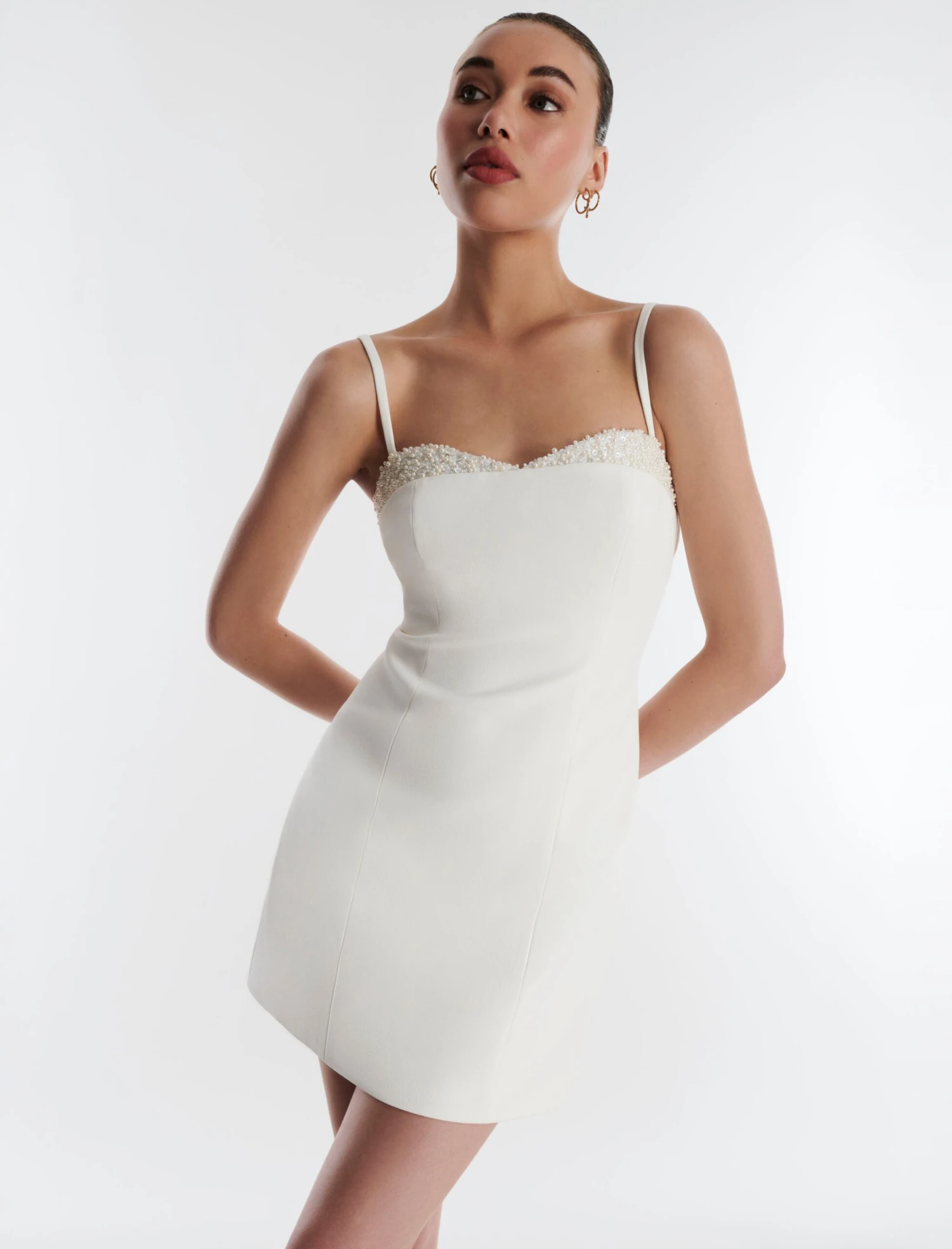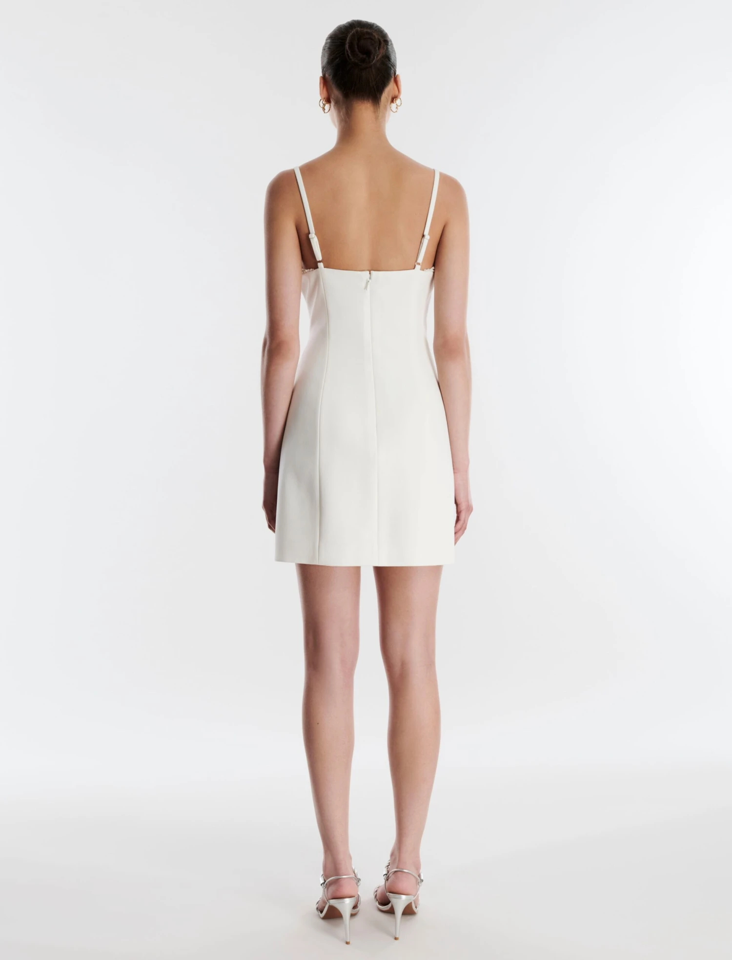 Ultra chic white mini dress cut from neo crepe. Topped with adjustable shoulder straps for a custom fit and a pearl encrusted sweetheart neck for a touch of sparkle. Designed in a flattering A-line shape that cinches the waist and accentuates the hips. Complete with a back zip and fully lined underneath.