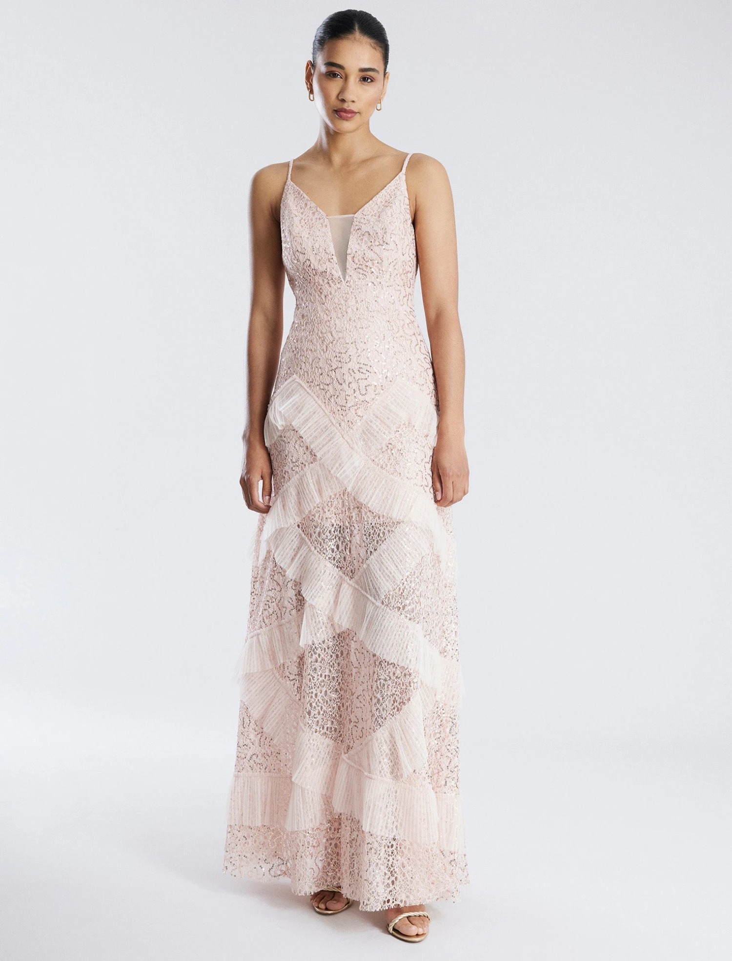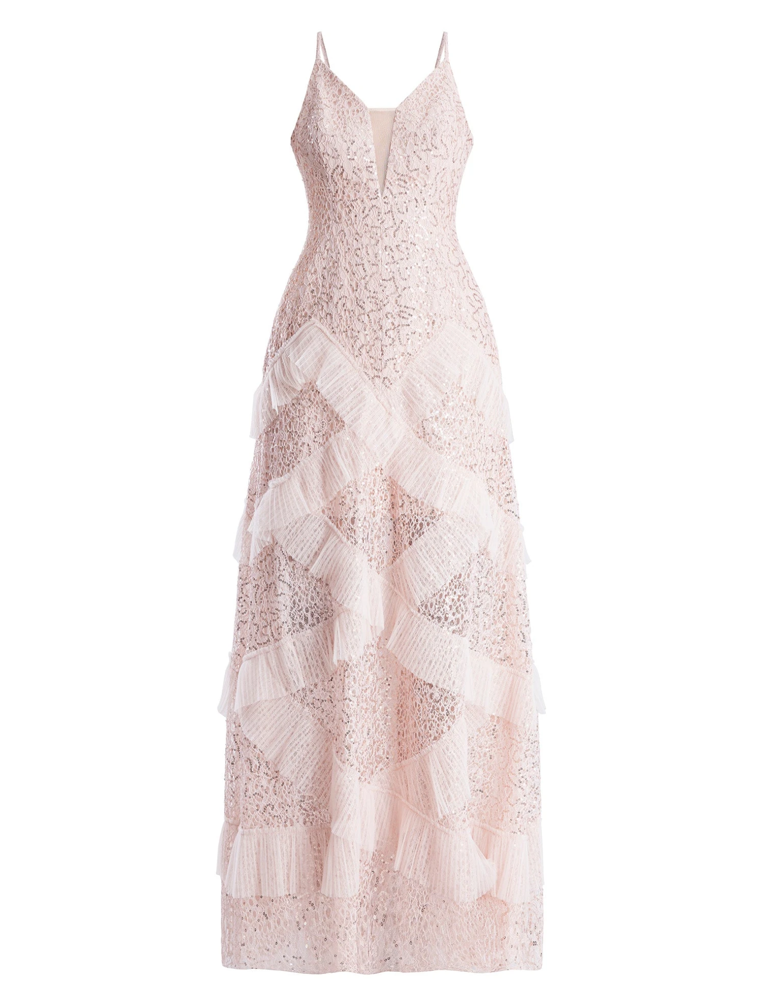 Dazzling light pink gown with plenty of sparkle. Done from beaded lace with a plunging illusion V-neckline and adjustable shoulder straps. Crafted in a flattering fit-and-flare silhouette with pleated ruffles draped along the skirt for a romantic mood. Bodice includes structured boning with a hidden back zip.