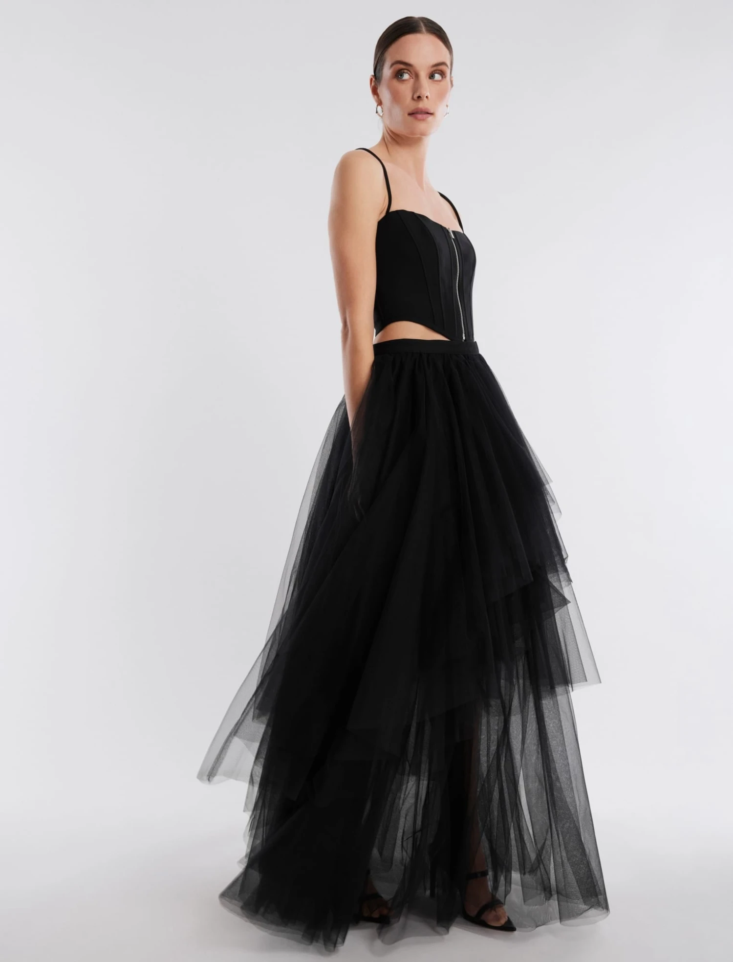 Ethereal full-length skirt cut entirely from sheer, lightweight tulle. Topped with a high-waistband with zip closure. Crafted with tiered ruffle layers for added volume and a romantic look.