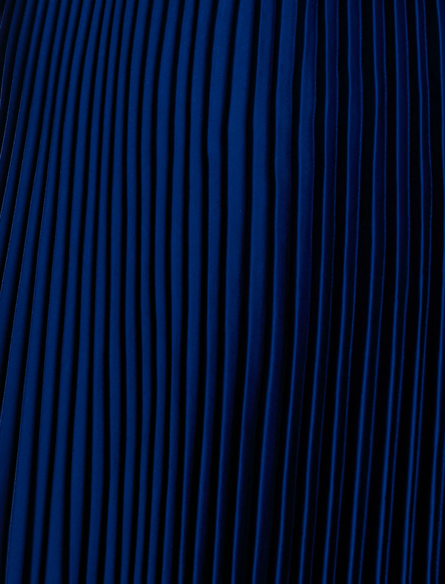 Polished satin midi dress with a smooth bodice and pleated skirt. Designed in a gathered one shoulder silhouette. Cinched with a belted waist and finished with a handkerchief hem and a hidden side zip.