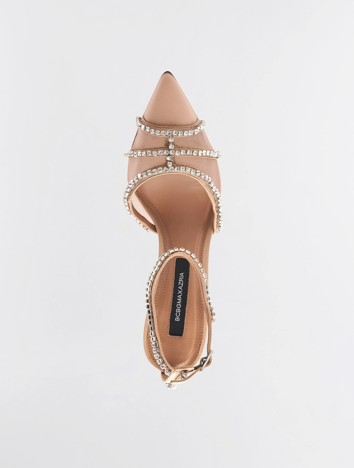Striking evening pump crafted from sheer mesh and smooth leather. Made with a pointed toe and embellished with sparkling rhinestones. Topped with a buckle ankle strap and finished with a stiletto heel.