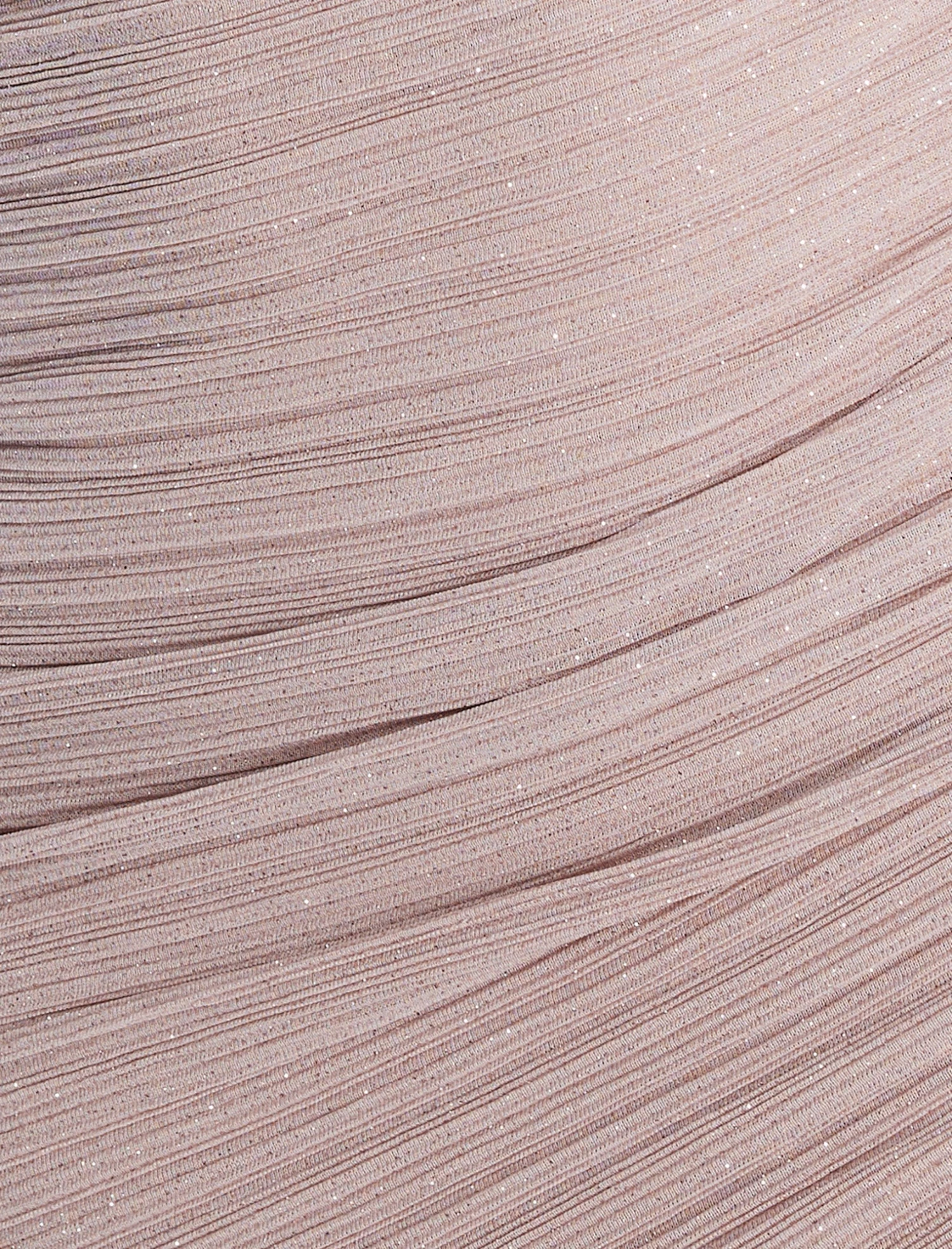 Shimmering nude mini dress made from a glitter crinkle knit for a sparkling finish. Done in a bodycon faux wrap design for a flattering shape. Crafted with a surplice V-neck topped with a bow accent at the shoulders. Finished with a secured back zip.