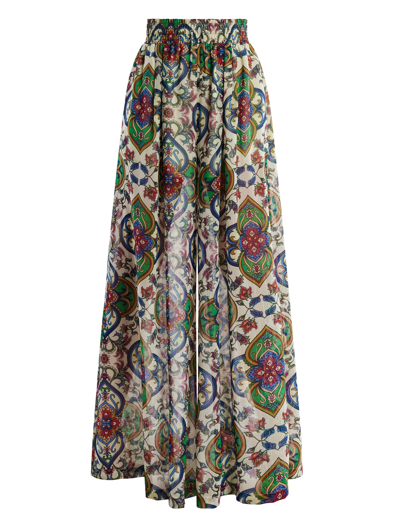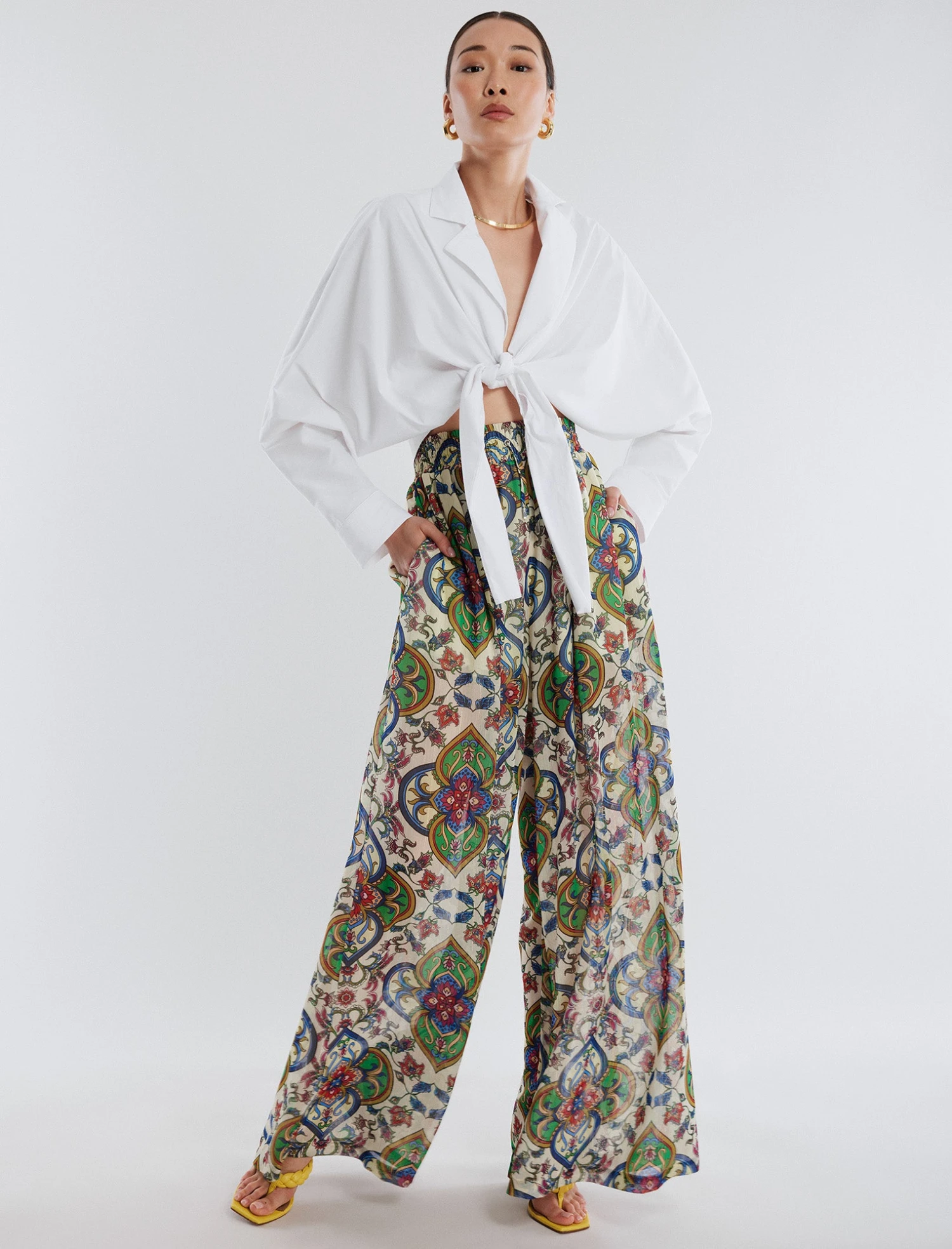 Bold printed pant crafted from crinkled chiffon with a hint of metallic for subtle shine. Designed with a smocked stretch waistband and an oversized wide-leg for a chic finish.