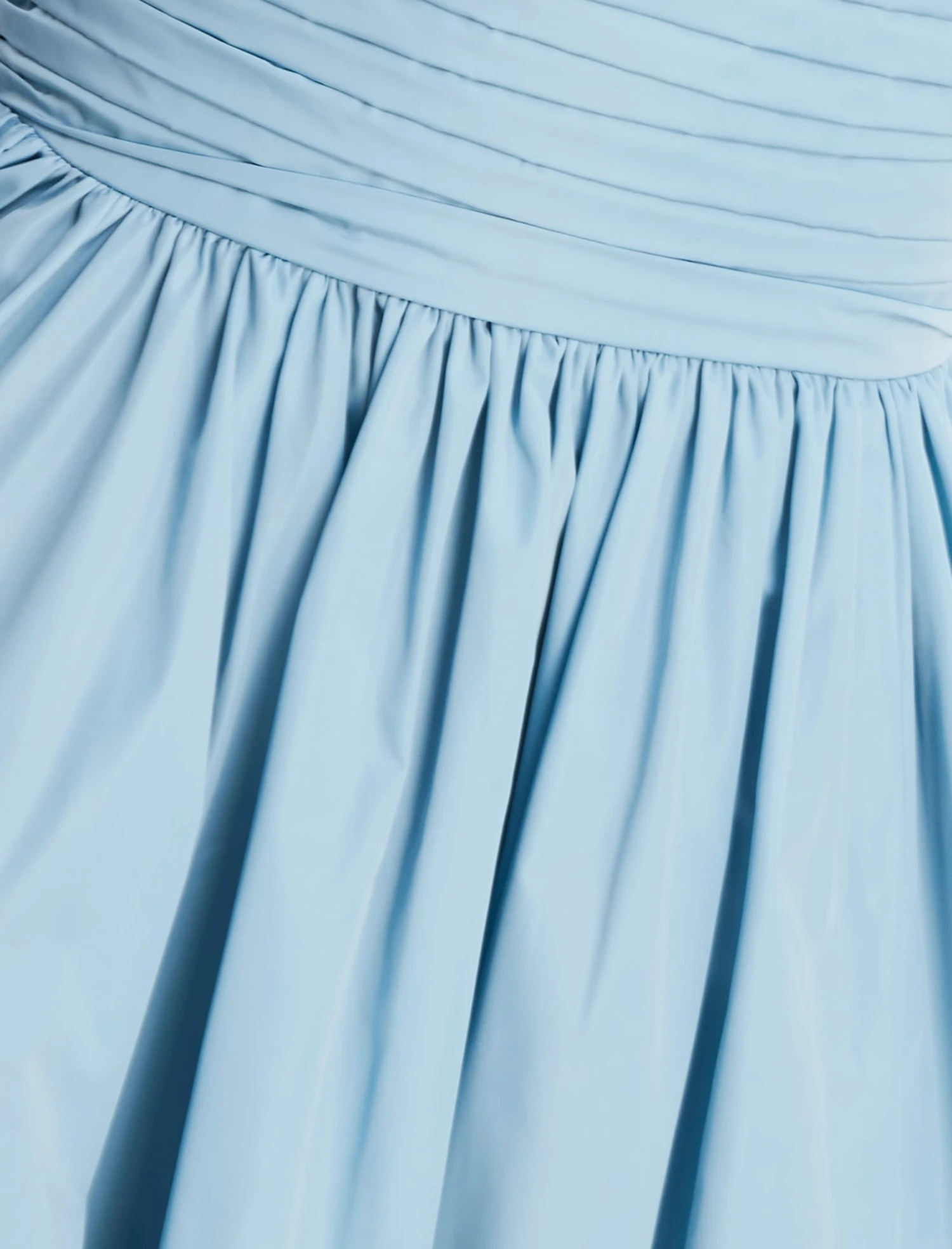 Enchanting evening gown cut from crinkled taffeta. Done with a plunging V-neck at the front and back cinched by a flattering wide waistband. Complete with a dreamy skirt crafted with draped sides for added volume. Finished with a back zip.