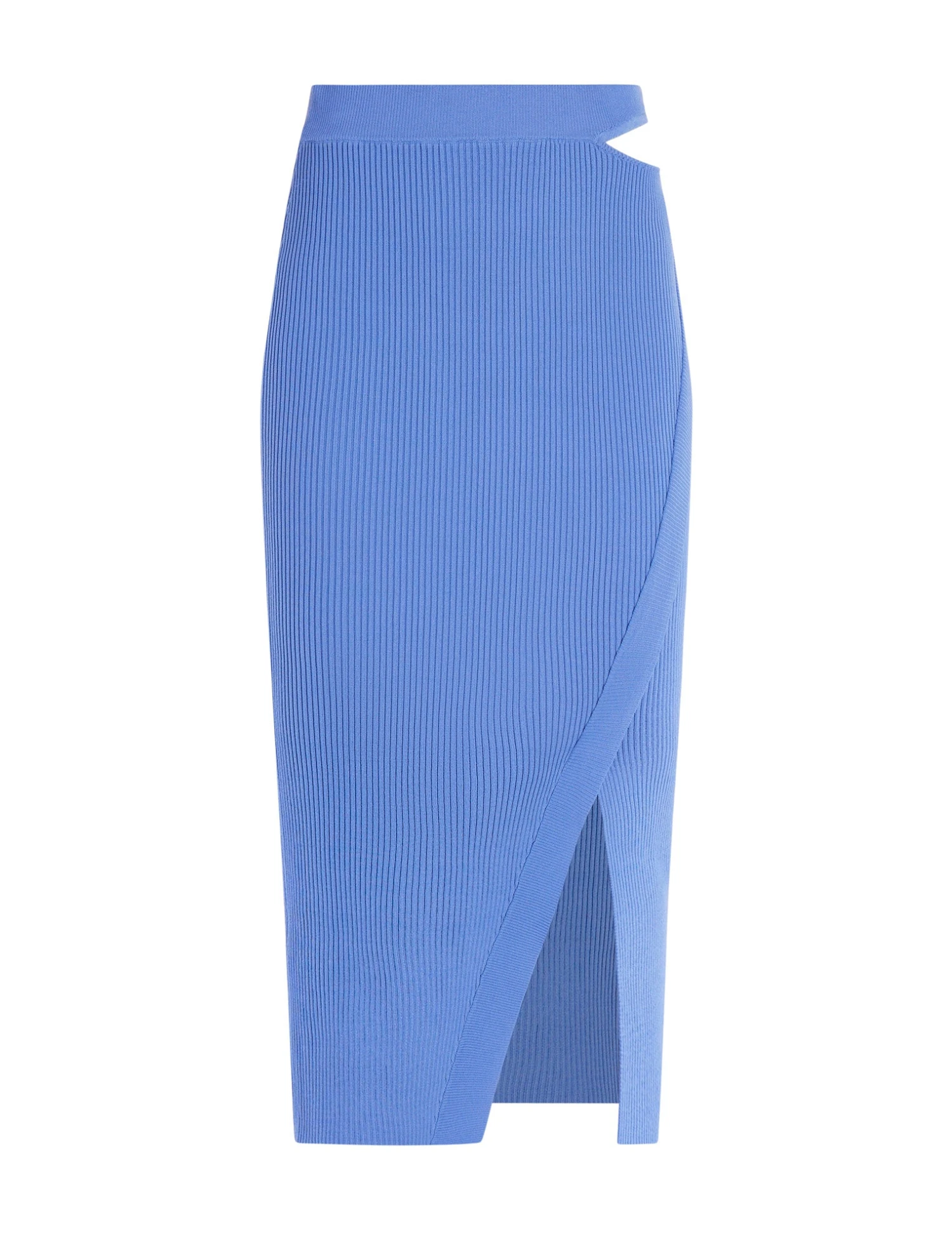 Bodycon midi skirt cut from a stretch rib knit. Done in a pull-on style with an asymmetrical waist cutout for a peek of skin. Finished in a faux wrap style with an off-center slit.