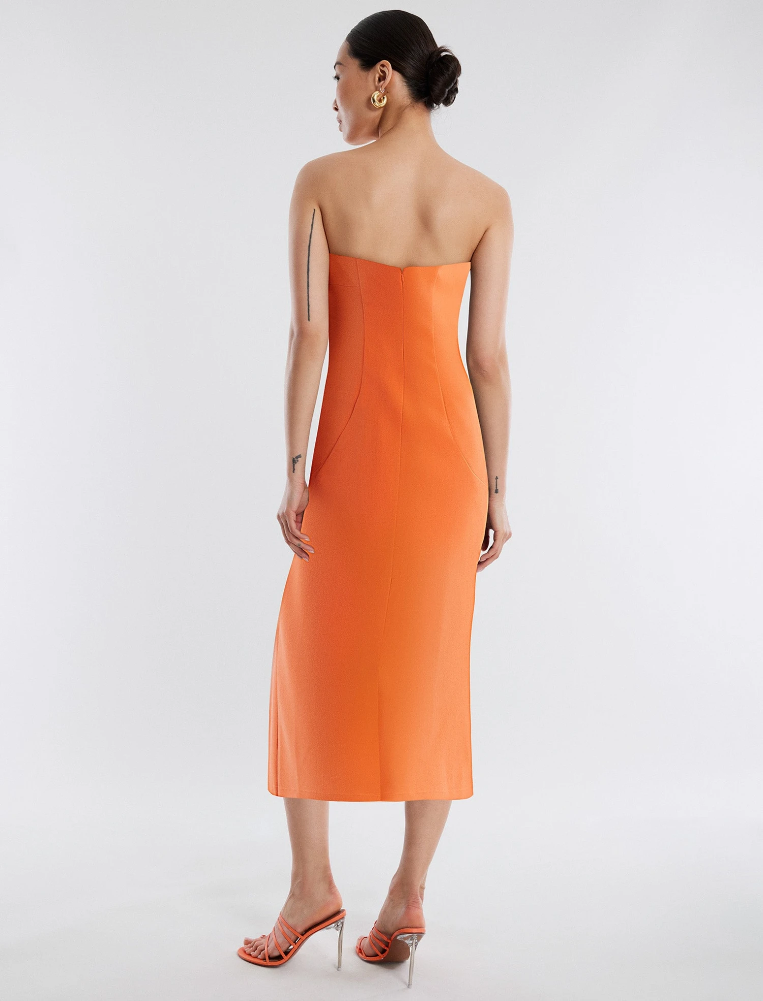 Sophisticated dress for just about any special occasion. Done in a sleek, minimal design with a strapless neckline and a midi-length hem that hits above the ankle. Cut from stretch crepe for a figure-flattering fit. Features a back vent and a concealed back zip.
